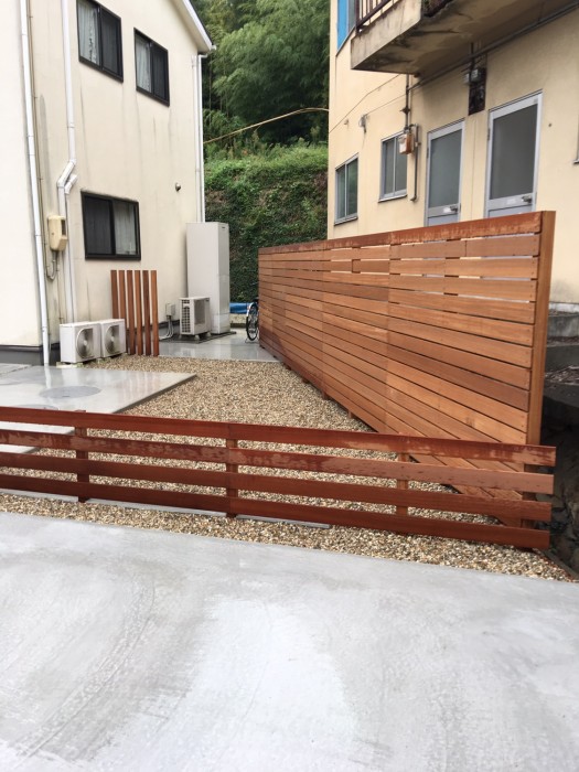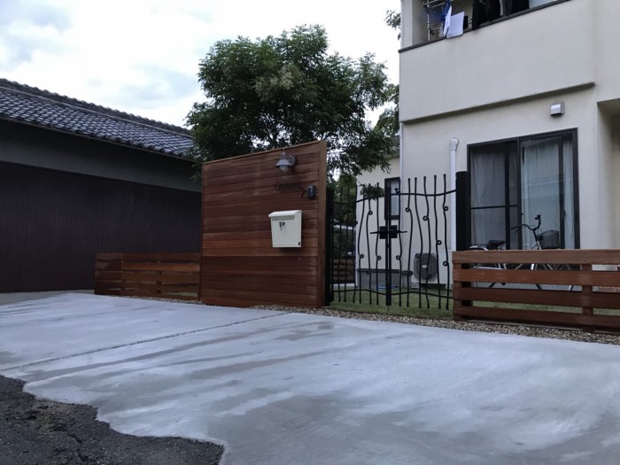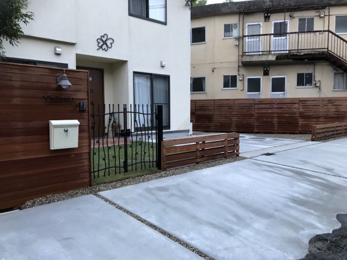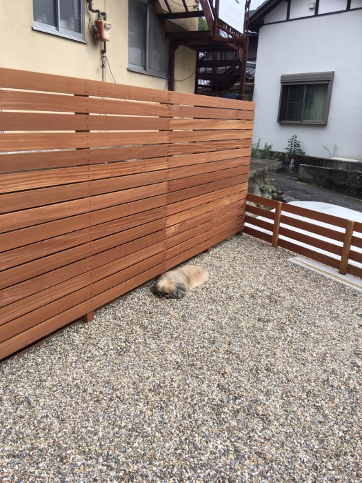 今回のご依頼は、ワンちゃんが快適に走り回れるようにとのことでして、宅外に飛び出さない為のフェンスを希望されており、門柱、目隠しスリット、フェンスなどをアイアンウッドで施工させていただきました!